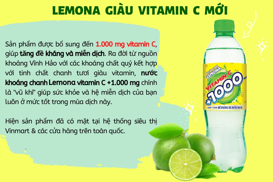 | Bổ sung đủ vitamin C: Theo bác sĩ Cao Hồng Phúc, vitamin C giúp tăng khả năng bạch cầu, tăng tổng hợp interferon từ đó tiêu diệt các tế bào chứa virus, ngừng hãm sự nhân lên và phát triển của virus khi chẳng may chúng đã lỡ xâm nhập cơ thể. Vì thế trong mùa dịch Covid-19, bổ sung vitamin C mỗi ngày giúp tăng cường đề kháng, hạn chế virus xâm nhập. Việc bổ sung vitamin C có thể từ nguồn tự nhiên hoặc các sản phẩm thay thế như nước khoáng chanh Lemona. Nước khoáng chanh Lemona Vitamin C được ra đời từ nguồn khoáng thiên nhiên Vĩnh Hảo giàu magie, natri, kali… với tinh chất chanh tự nhiên giúp cung cấp đủ lượng vitamin C cần thiết cho cơ thể trong mùa dịch: 1.000 mg vitamin C/1 lít. (*) |