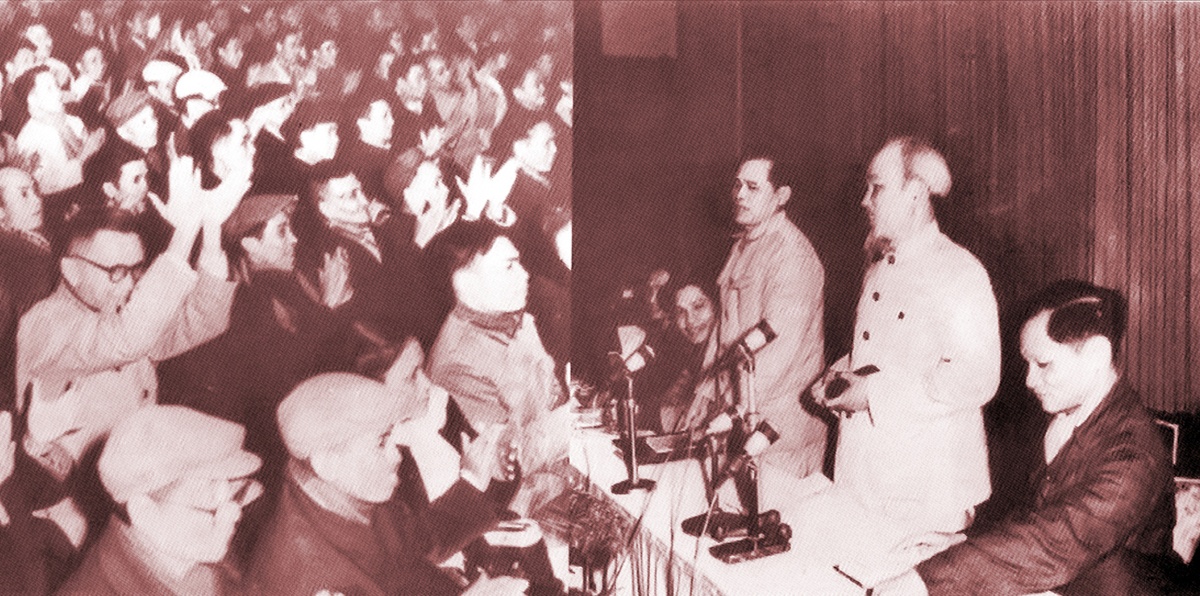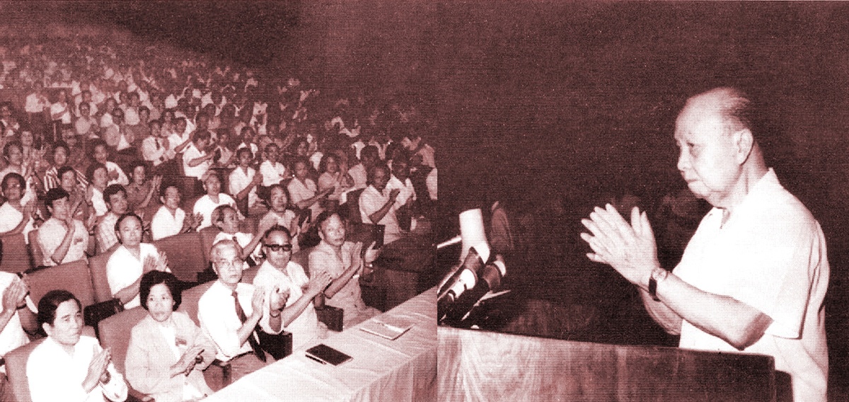 | Cố Tổng Bí thư Trường Chinh dự và phát biểu tại Đại hội đại biểu Đảng bộ TP Hà Nội lần thứ 10 (1986). |