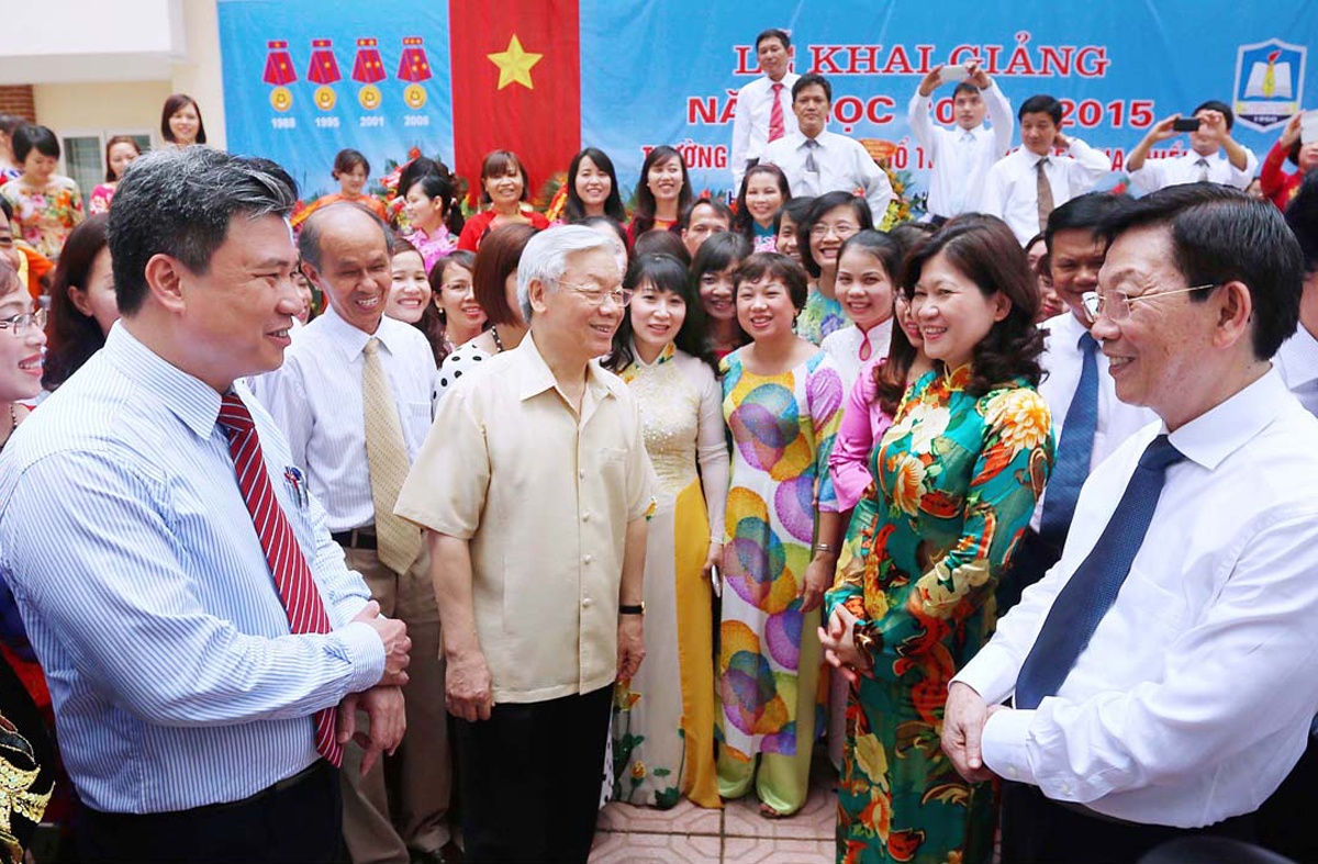 Tổng Bí thư Nguyễn Phú Trọng dự lễ khai giảng với thầy trò Trường THPT Nguyễn Gia Thiều, quận Long Biên (2014).