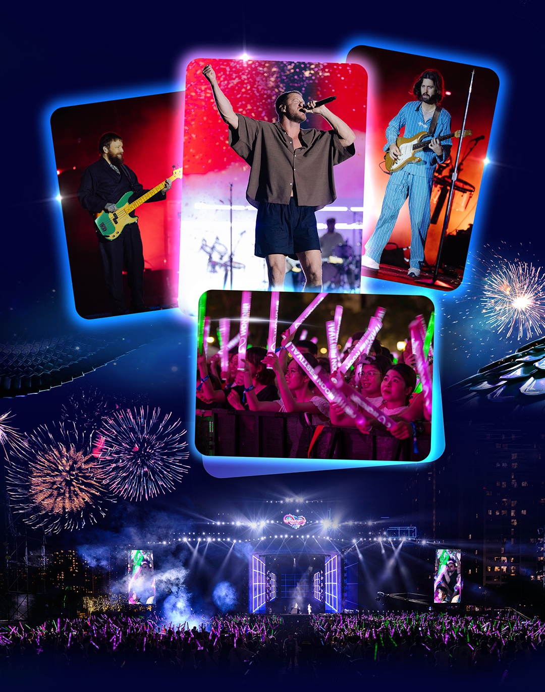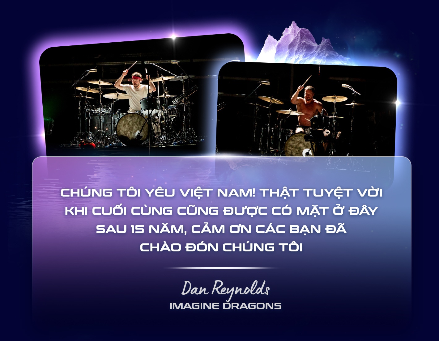 Đáp lại tình cảm của fan Việt, nhóm nhạc huyền thoại bày tỏ: “Chúng tôi yêu Việt Nam”. Màn trình diễn của Imagine Dragons kết thúc bằng pháo hoa rực rỡ, khép lại hành trình âm nhạc mãn nhãn và thăng hoa, đáng nhớ đến từng khoảnh khắc.