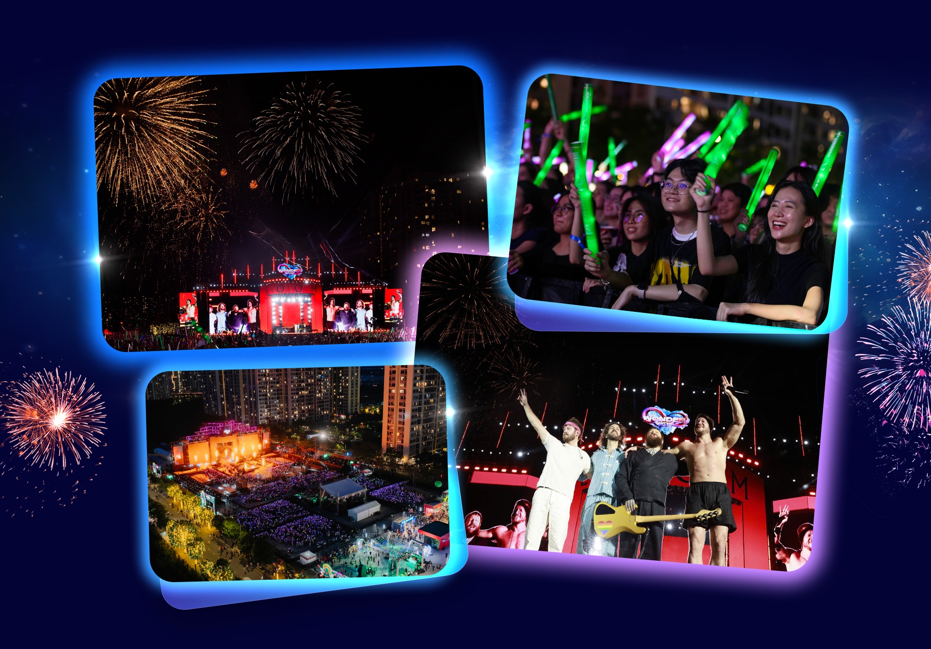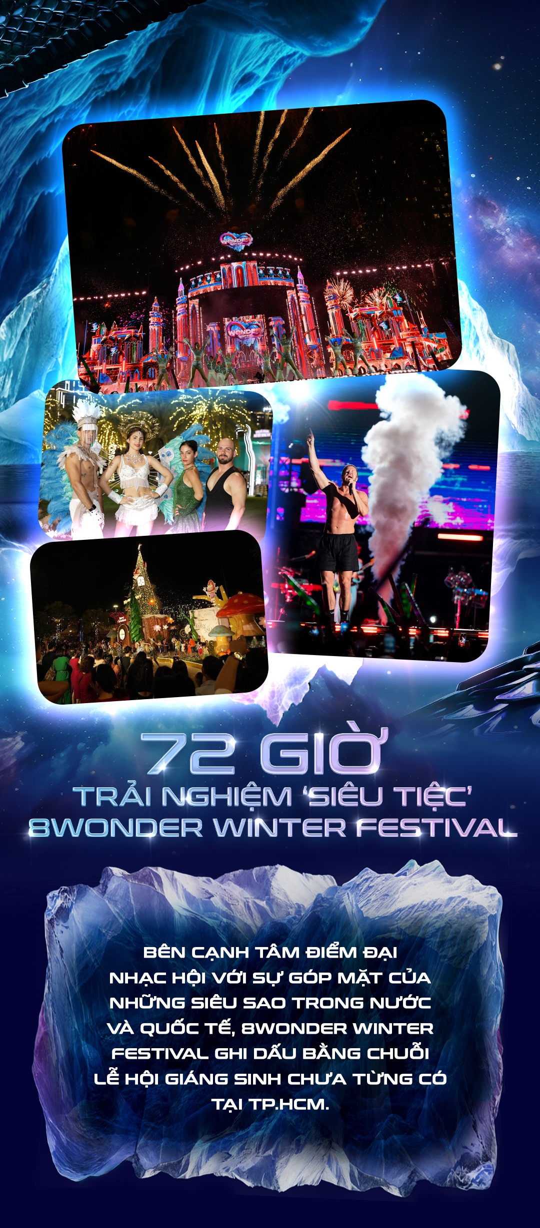 Không chỉ mang mùa đông tuyết trắng đến TP.HCM với “liên hoàn” lễ hội Giáng sinh tưng bừng, 8Wonder Winter Festival 2024 còn ghi dấu bởi đại nhạc hội quy mô với sự góp mặt của ban nhạc Imagine Dragons - chủ nhân giải thưởng Gramy danh giá, cùng 7 ngôi sao V-Pop trên sân khấu hoành tráng. Hơn 30 bài hát cùng khoảnh khắc kết show mãn nhãn với pháo hoa ngợp trời đã để lại cảm xúc khó quên cho hàng chục nghìn khán giả có mặt tại siêu nhạc hội và hơn 13 triệu lượt theo dõi livestream.