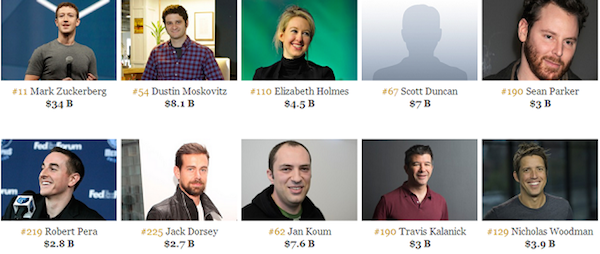 Ba người đứng đầu trong số đó là những trường hợp bỏ học nổi tiếng nhất trong giới công nghệ: Mark Zuckerberg (tổng tài sản 34 tỷ USD, từng học ở Harvard), Dustin Moskovitz (tổng tài sản 8,1 tỷ USD, từng học ở Harvard) và Sean Parker (tổng tài sản 3 tỷ USD, chưa từng học đại học). Đó đều là những người đã thành lập ra mạng xã hội Facebook.