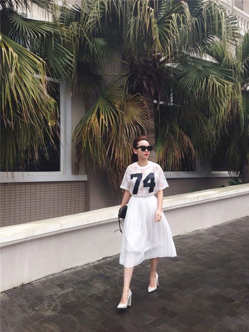 | Hương Giang kết hợp xu hướng layer với tông trắng rất nữ tính. |