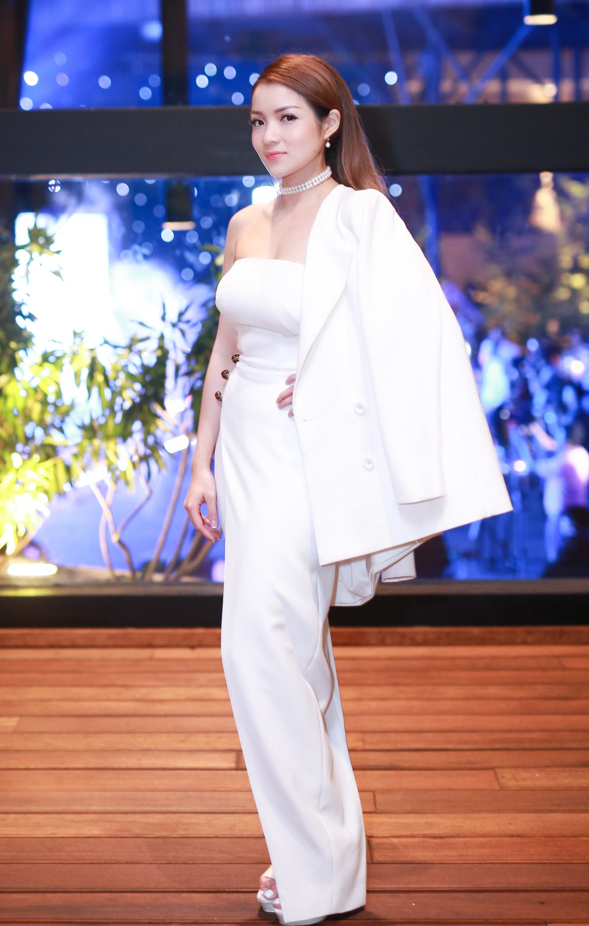 | Trang phục tông trắng, phối áo khoác hờ giúp Thủy Top trông sang trọng và sành điệu khi dự tiệc cuối tuần. Phụ kiện và trang sức đồng điệu mang đến vẻ đẹp hoàn hảo cho tổng thể. Tông trang điểm và kiểu tóc hiện đại. Ảnh: Huyền Thương |