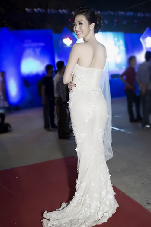 | Minh Hằng trở nên đằm thắm và nữ tính hơn nhờ chiếc đầm tôn dáng vóc và khoe bờ vai thon. |