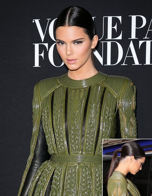 | 6.Tóc đuôi gà thẳng mượt: Vuốt toàn bộ tóc ra phía sau và buộc gọn lại cũng giúp Kendall có một kiểu tóc dự tiệc đẹp mắt. |