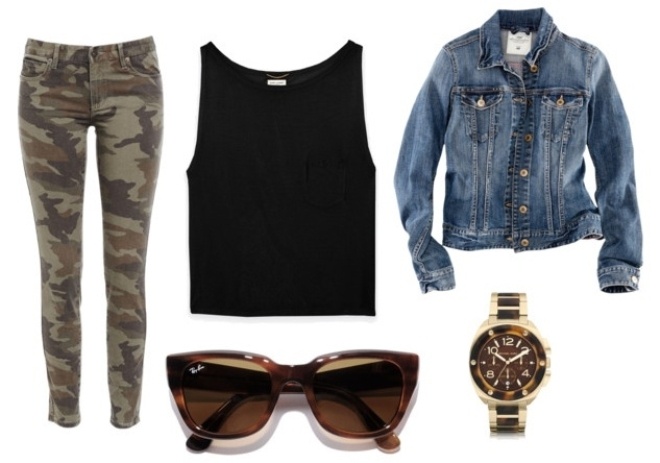 | Quần họa tiết camo mix với áo thun đen, thêm áo khoác denim tạo nên sự