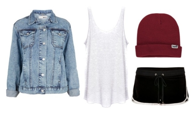 quần shorts thun, áo ba lỗ và chiếc mũ len trùm đầu cá tính. |
