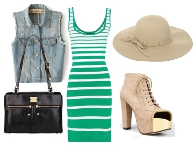 | Một chiếc váy midi kẻ sọc, kết hợp cùng boots cao gót hở mũi và mũ vành