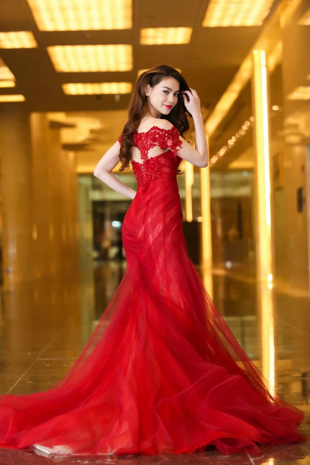 | Tông đỏ nóng bỏng là gam màu ưa thích của giọng ca Em đi tìm anh. Trang phục dạ hội bồng xòe, cổ trễ diềm ren để lộ vai trần gợi cảm. |