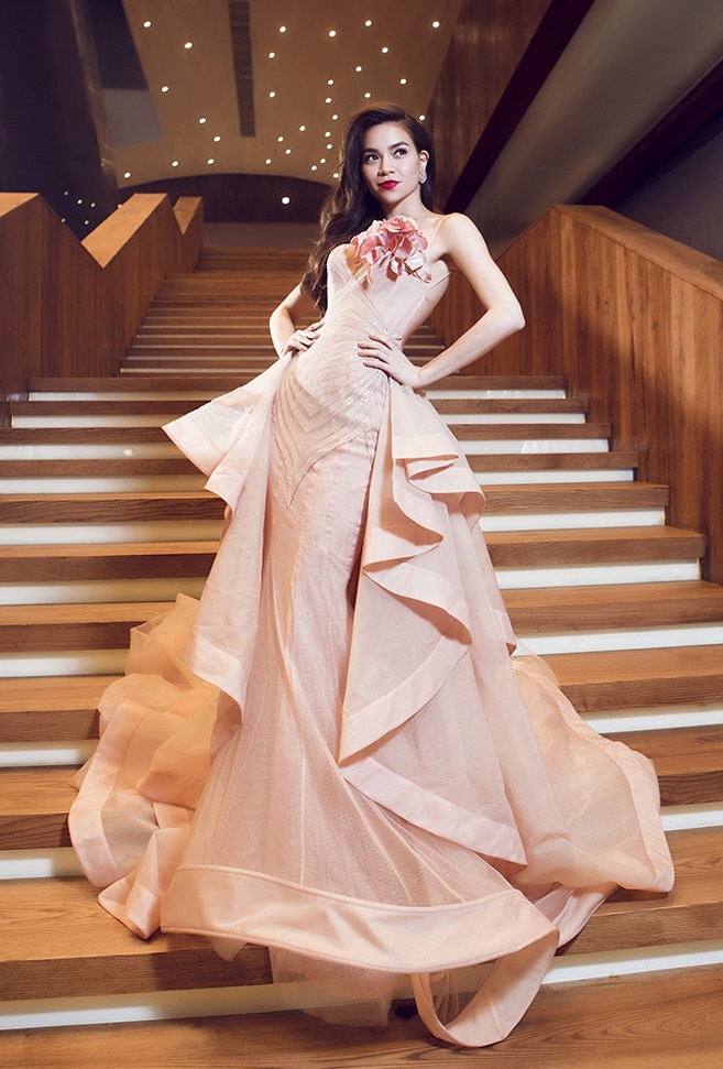 | Hà Hồ nhiều lần ghi điểm với trang phục màu hồng phớt. Thiết kế trễ vai được điểm họa tiết hoa duyên dáng. |