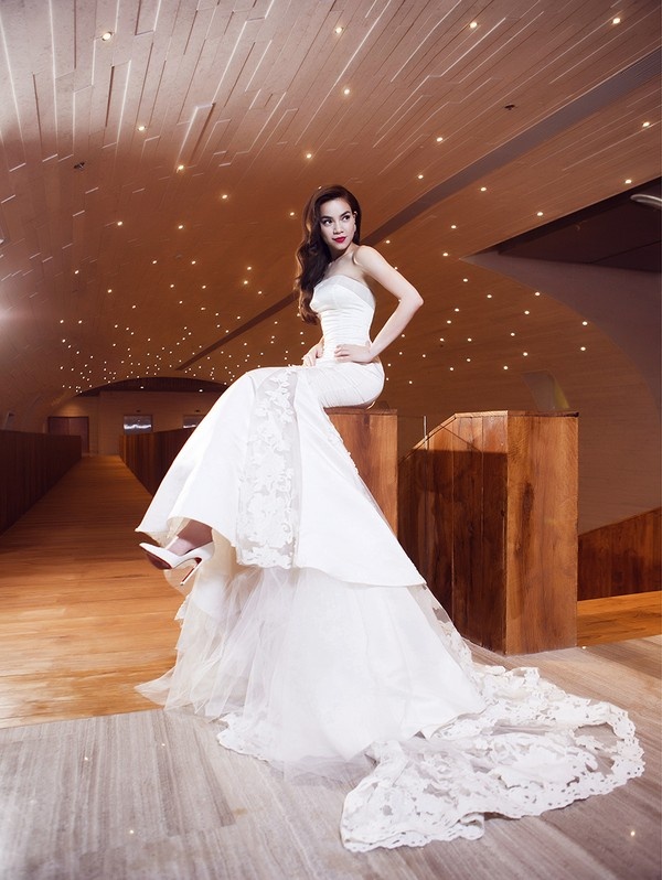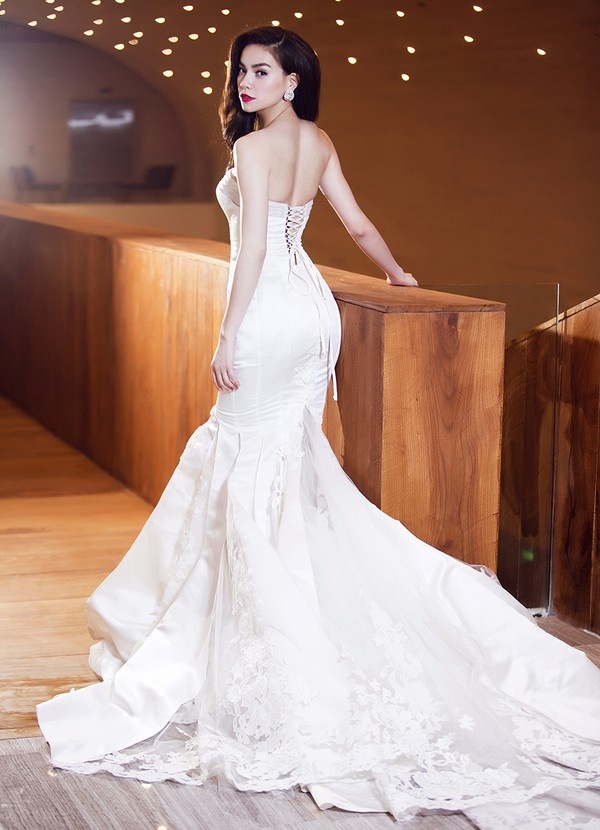 Chiều cao lý tưởng, nước da trắng giúp "nữ hoàng giải trí" dễ dàng tạo dựng phong cách quyến rũ với đầm đuôi cá chất liệu voan ren mềm mại.