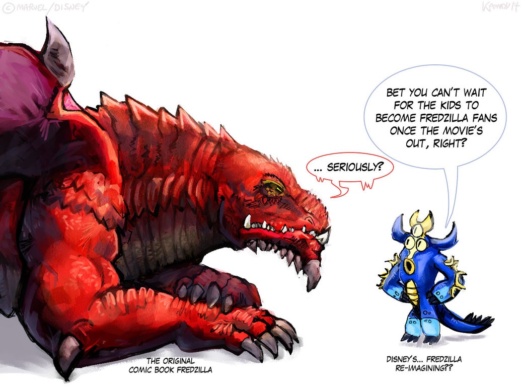 Nhân vật Fred, một thành viên của Big Hero 6, luôn ước ao mình có thể… “đột biến” và trở thành một con thằn lằn khổng lồ. Trong nguyên tác, nhân vật này chính xác là có thể trở thành một con thằn lằn khổng lồ với khả năng phun lửa, chứ không phải chỉ mặc phục trang như trong phim.
