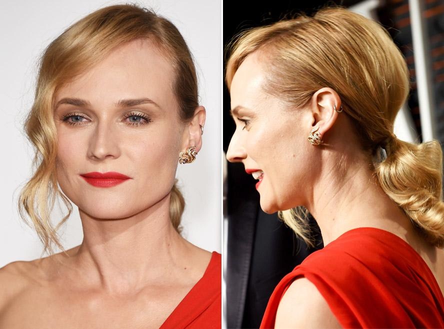 Tóc buộc uốn sóng: Diane Kruger mang tới gợi ý phong cách dự tiệc với mái tóc lửng uốn xoăn cổ điển. Sau khi tạo độ phồng cho tóc, bạn buộc thấp chúng lại, kết hợp với một chút mái buông rủ bên góc mặt.
