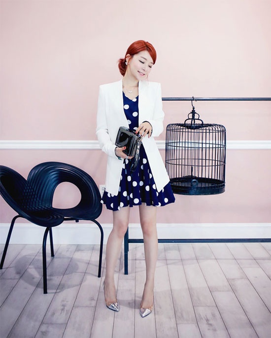 | Một trong những dáng váy mang lại nét dịu dàng được các cô nàng tiểu thư ưa chuộng ngày nắng lên là váy họa tiết chấm bi. Để dáng váy sát nách thêm thanh lịch, bạn có thể chọn phối hợp thêm áo khoác blazer đi cùng. |