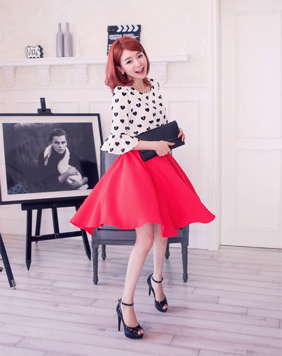 | Cô nàng cá tính và có gu thẩm mỹ nhất định, hãy thử diện chân váy xòe đỏ nổi bật phối cùng áo họa tiết hình tim đáng yêu. |