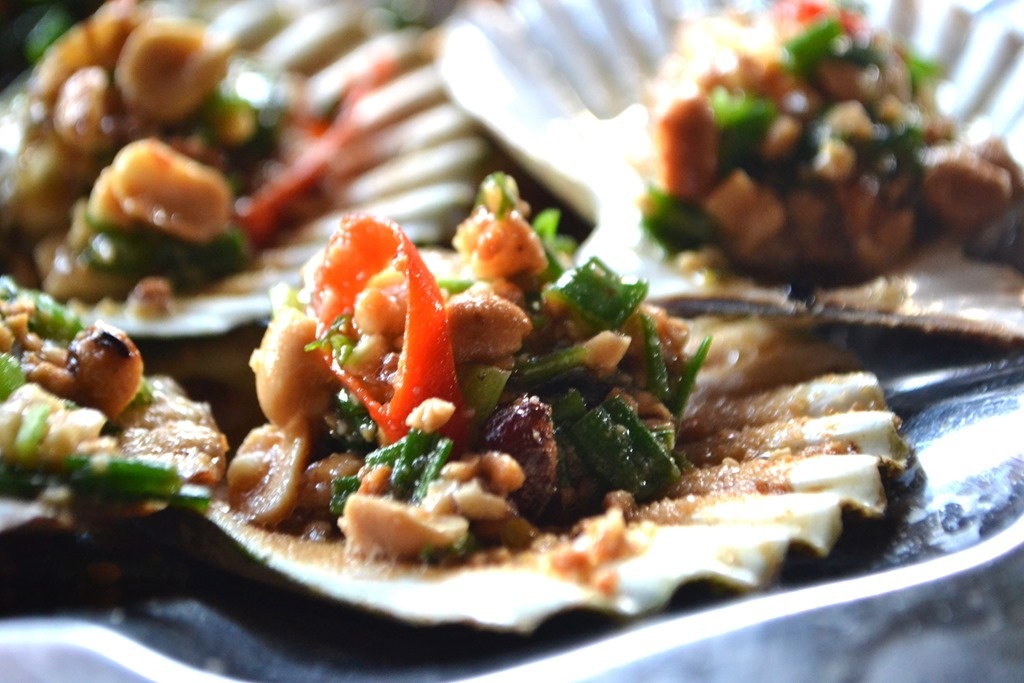 Thuộc dòng hải sản đơn giản, dễ ăn, sò điệp nước mỡ hành “mê hoặc” thực khách với vị ngon của loại hải sản tươi, chắc thịt, hương thơm của món nướng, cái béo ngậy của mỡ, thơm thơm của hành, giòn tan của đậu phộng.