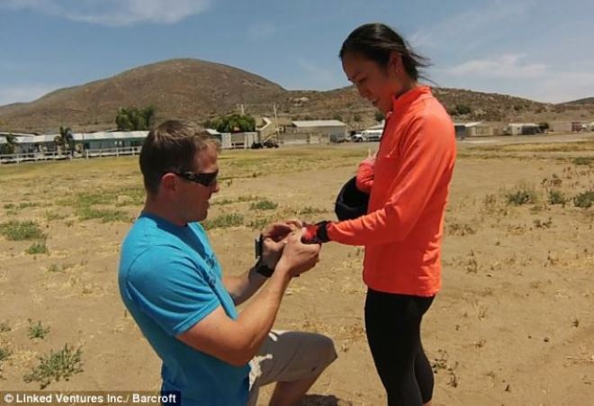 Kế hoạch không thành khi những cơn gió mạnh khiến Bradon tuột tay và làm rơi mất chiếc nhẫn. Lúc tiếp đất, chàng trai người Mỹ đành phải dùng một chiếc nhẫn giả tượng trưng để cầu hôn bạn gái. Rất may, Nicole đã không giận và vui vẻ nhận lời. (Ảnh: Daily Mail)