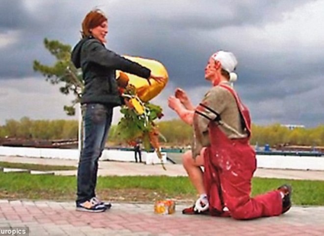 Irena Kolokov - bạn gái của Alexey được sắp xếp đến hiện trường và không ngừng khóc khi trông thấy cảnh tượng này. Không để người mình yêu phải đau lòng quá lâu, anh chàng Nga đã nhanh chóng bật dậy và ngỏ lời cầu hôn. Tức giận vì trò đùa tai quái, ban đầu Irena đã không đồng ý, chỉ đến khi nghe bạn trai giải thích, cô mới gật đầu trong niềm vui sướng tột cùng. (Ảnh: Daily Mail)