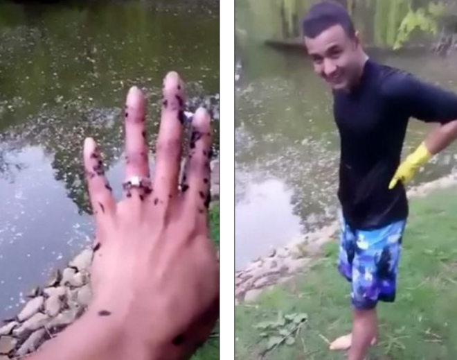 Tuy nhiên, nhẫn chưa kịp trao tay đã không may rơi xuống hồ nước. Do đó, thay vì tiếp tục nói những lời có cánh, cặp đôi này phải đeo găng tay, mặc quần ngắn để xuống tìm nhẫn. Được biết, chiếc nhẫn này do chính Sharif thiết kế và được làm bằng kim cương. Chàng trai người Anh cho hay, cả hai đã mất đến 3 tiếng đồng hồ lội ở hồ, mò tay vào bùn đất mới có thể tìm thấy báu vật của mình. (Ảnh: Daily Mail)