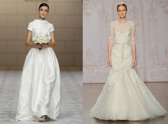 | Đây cũng là kiểu váy cưới rất đẹp đôi với những cô dâu yêu chuộng vẻ đẹp kín đáo, thanh lịch. Các kiểu cổ lọ, cổ thuyền kết hợp khoảng xuyên thấu nhẹ nhàng kèm trang trí đính đá, thêu hay họa tiết hoa 3D tinh tế hứa hẹn sẽ là một trong những xu hướng váy cưới rất nóng trong mùa cưới năm nay. |