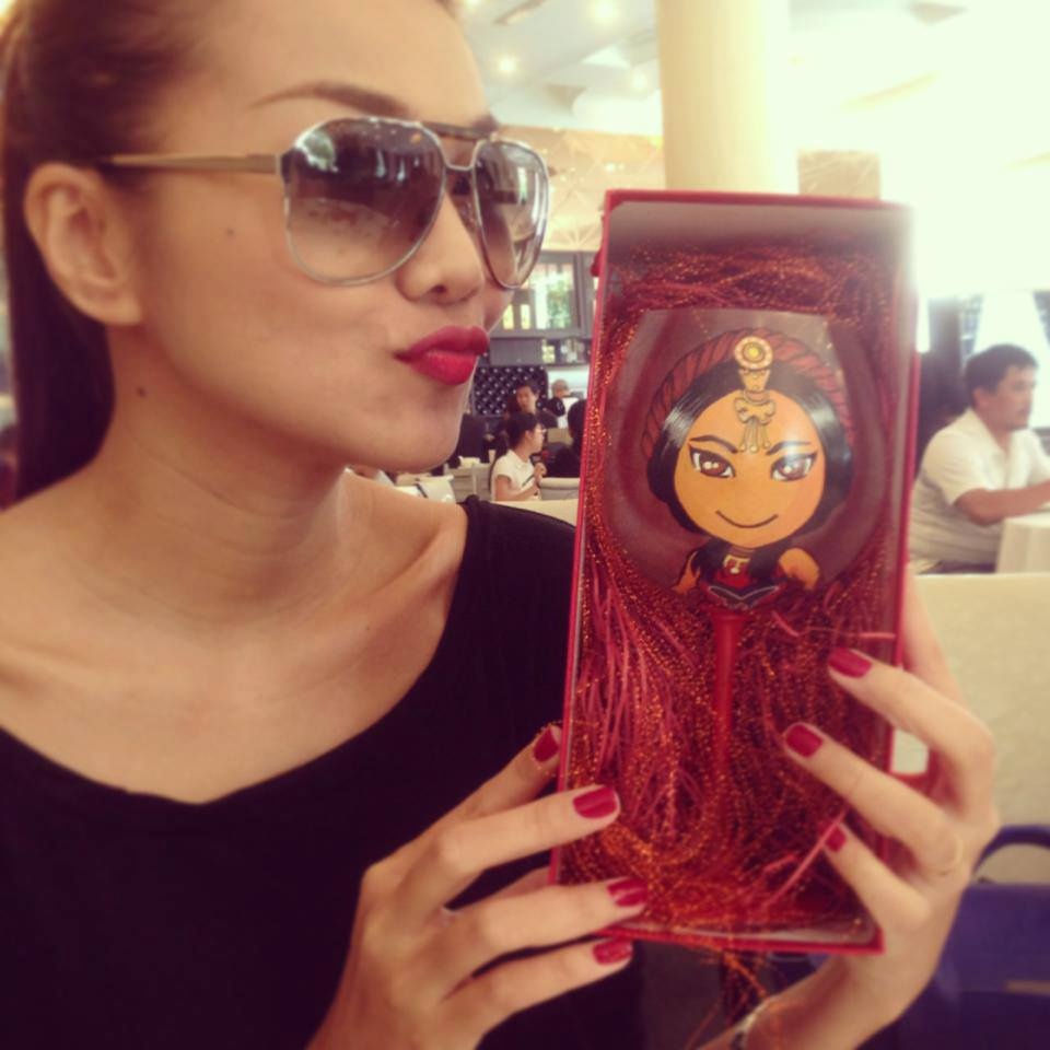 | Người mẫu Thanh Hằng khoe tác phẩm chân dung của mình trong bộ phim Mỹ Nhân Kế do Tuấn Khôi thực hiện. Nhiều nghệ sĩ khác cũng đặt hàng Khôi vẽ chân dung. Ảnh: TH. |