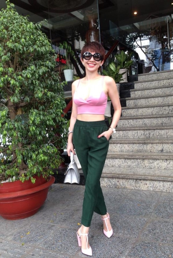 | Một trong những bí quyết kéo dài chân hiệu quả nhất chính là việc sử dụng quần cạp cao, giúp ăn gian phần eo khéo léo. Tóc Tiên với sự kết hợp quần cạp cao và crop top rất gợi cảm. |