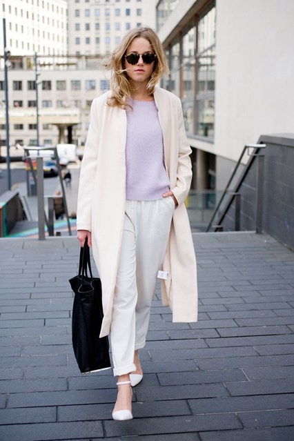 4. Gam màu pastel: Bạn gái thích sự nữ tính và duyên dáng nên kết hợp gam trắng với tông pastel. Quần trắng ống đứng kết hợp áo chui cổ màu tím hoa cà với điểm nhấn là túi oversize và giày cao gót điệu đà. Vào mùa đông, bạn có thể giữ ấm cơ thể bằng một chiếc áo khoác. |