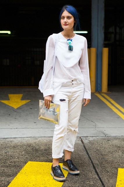 5. Phá cách: Quần baggy rách màu trắng, giày buộc dây flatform kết hợp áo thiết kế lạ mát và túi xách metallic mang lại sự trẻ trung và cá tính cho bạn khi xuống phố. |