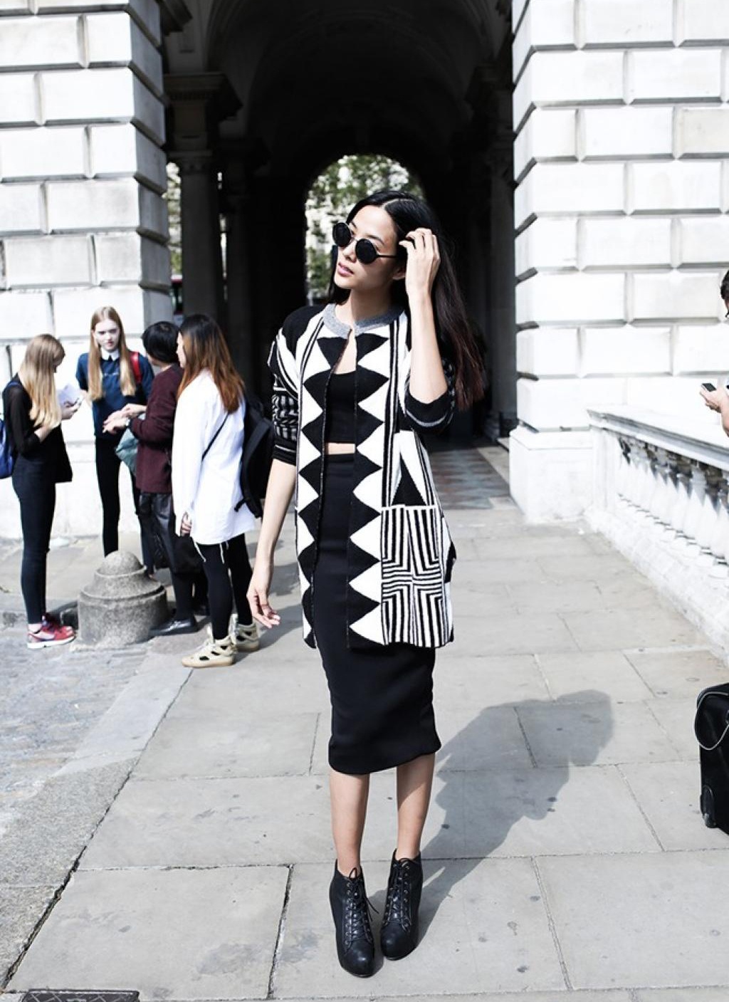 | Họa tiết hình học rất thích hợp với các kiểu áo khoác oversize. |