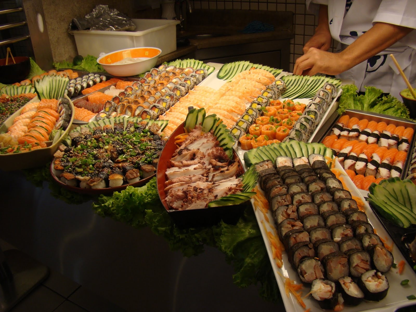 Buffet sushi. Một bữa tiệc sushi thường dao động từ 20 – 50 loại sushi khác nhau phụ thuộc vào mức giá hay nhà hàng quy định. Tấ nhiên, các món ăn kèm như gừng ngâm, wasabi, nước tương terayaki cũng được bài trí sẵn để bạn sử dụng. |