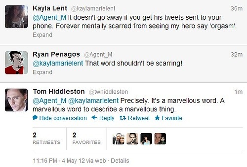 6. Mr. Hiddleston rất chịu khó giao lưu với fan trên Twitter: Tom là một trong số ít ngôi sao thực sự bỏ thời gian bận rộn để trả lời những tweet của người hâm mộ tới từ khắp nơi trên thế giới. |