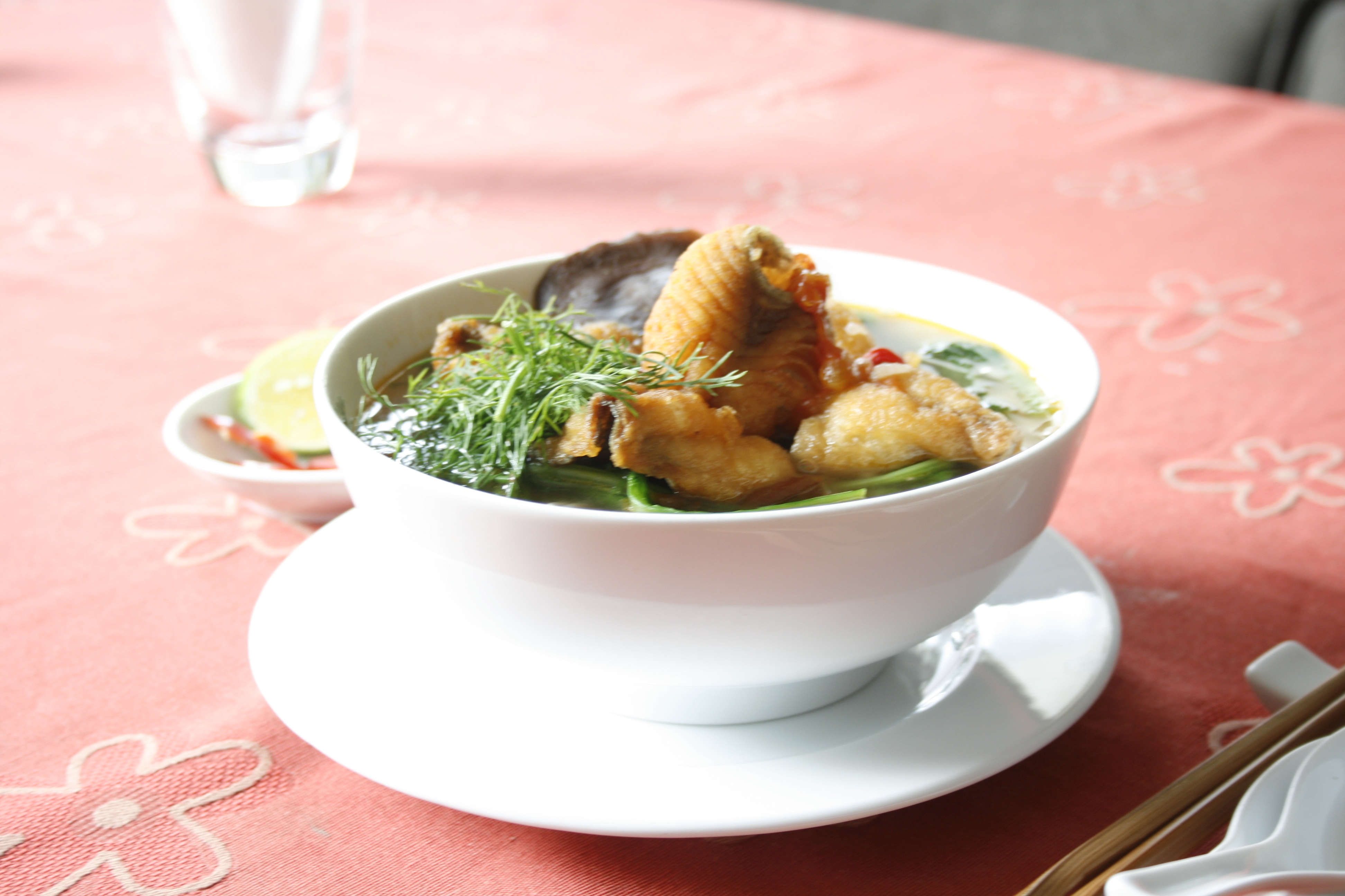 | Bún kèn. Tên khá lạ, song bạn có thể tìm thấy bún kèn ở Châu Đốc, Phú Quốc hay Hà Tiên. Bún kèn được chế biến từ cá dựng, cá nhồng, cá rựa hay cá lẹp vàng. Món bún này có cách chế biến không quá phức tạp nhưng lại đòi hỏi sự tỉ mẩn và kiên nhẫn. Bún kèn dùng chung với rau sống, đu đủ bằm nhuyễn, húng thơm. Ảnh: Dulichhatien |