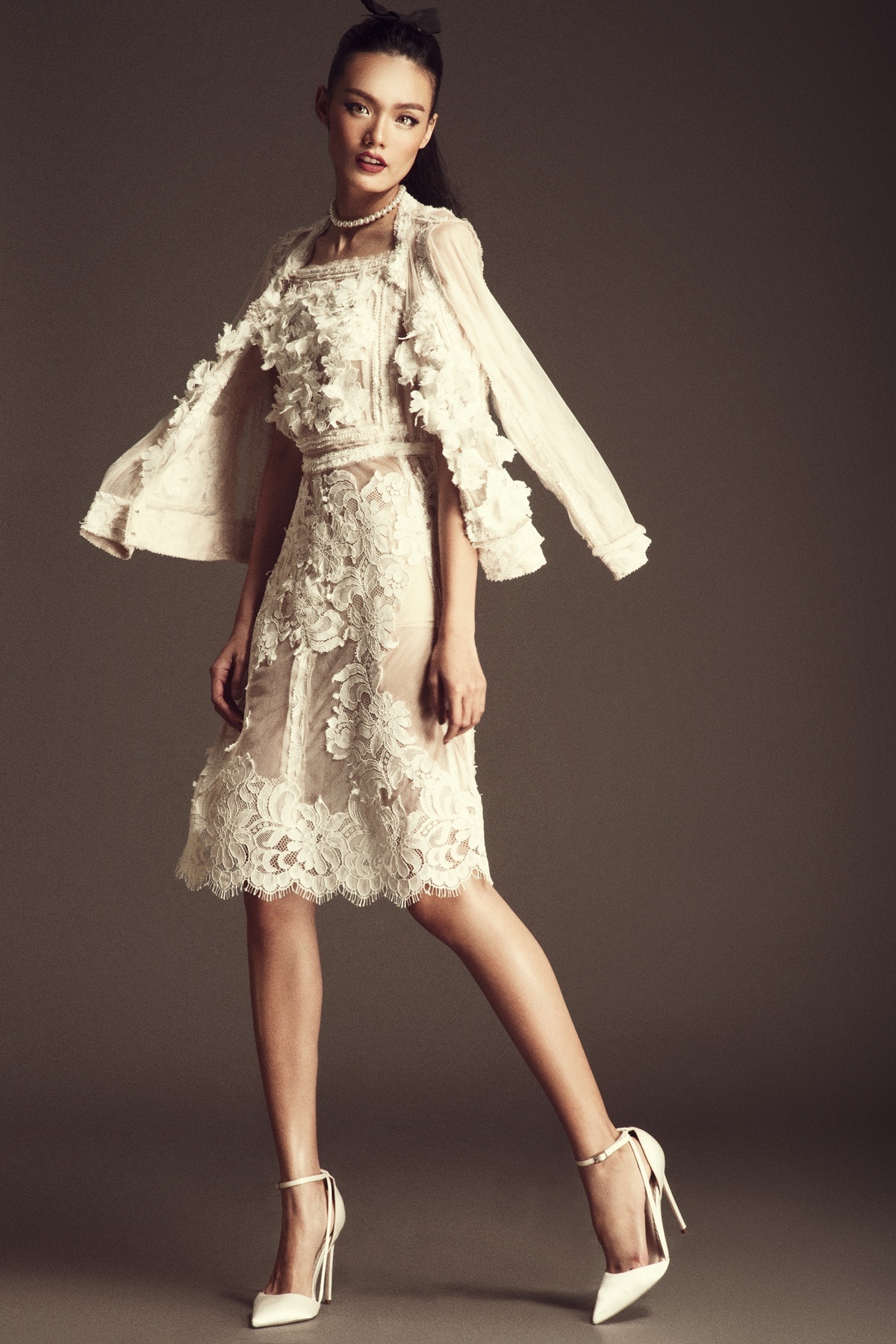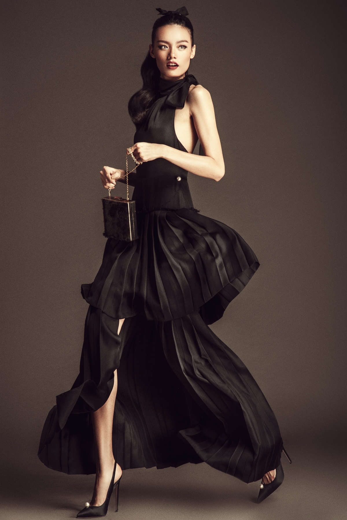 | Váy xếp ly, tầng lớp được cách điệu và làm mới với đường xẻ tà gợi cảm. Phom áo cao cổ điểm nơ duyên dáng. |