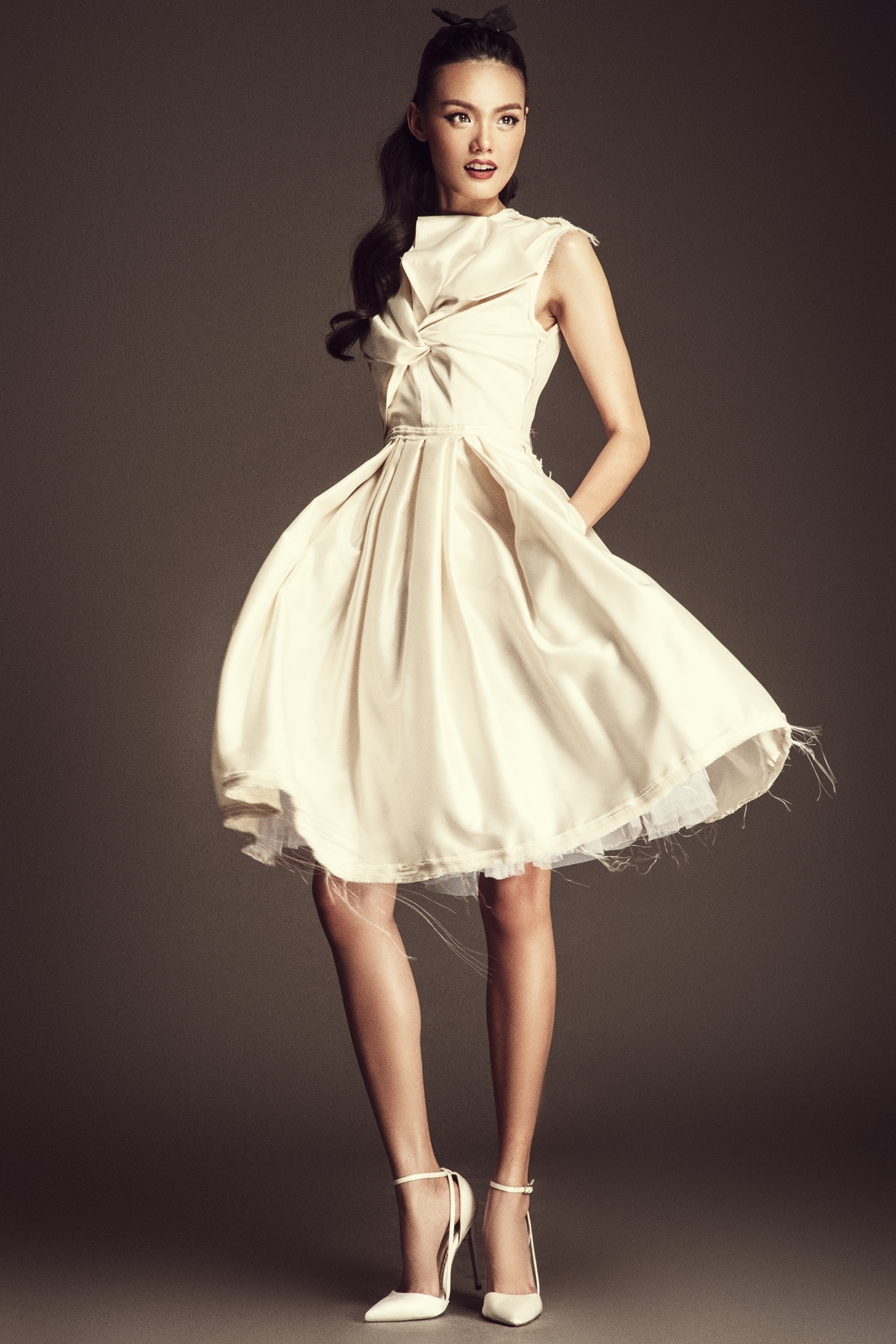 | Lụa mềm mại mang đến cảm hứng thanh lịch, nhẹ nhàng cho tổng thể. Điểm nhấn thắt nút ở thân áo là một trong những sở trường của nhà tạo mốt trưởng thành từ Project Runway Vietnam. |