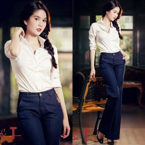| Ngọc Trinh thanh lịch với mẫu quần jeans cạp cao, kết hợp ống loe cổ điển. |