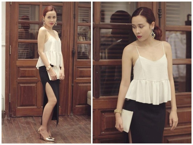 | Lưu Hương Giang kết hợp khéo léo váy hai dây và váy bút chì xẻ cho thời trang tiệc tùng. |