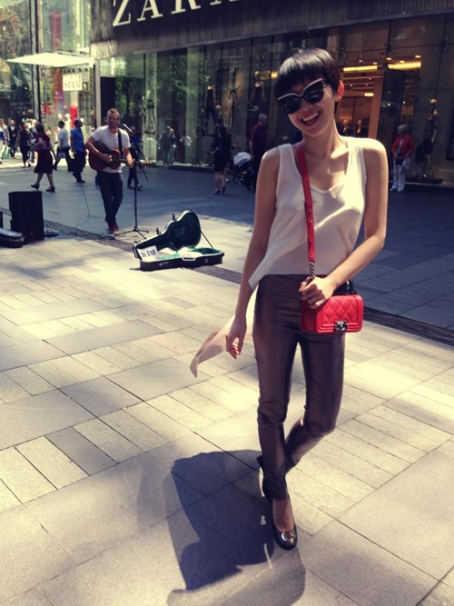 | Tóc Tiên với chiếc túi vuông Chanel bé xíu trẻ trung trên phố. |