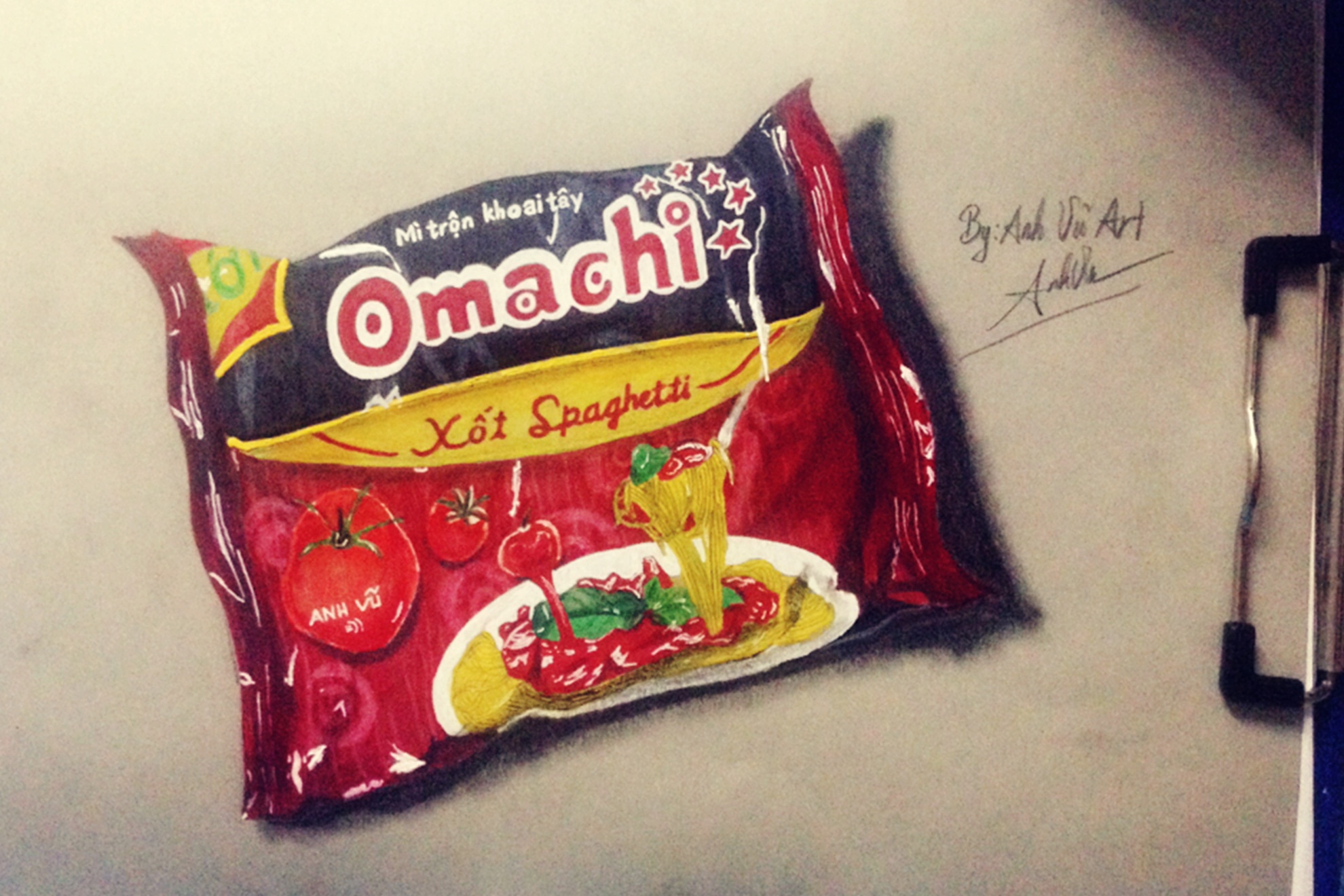 | Tác phẩm gói mỳ ăn liền được Anh Vũ thể hiện tinh tế, sống động như thật. Ảnh: S.T. |