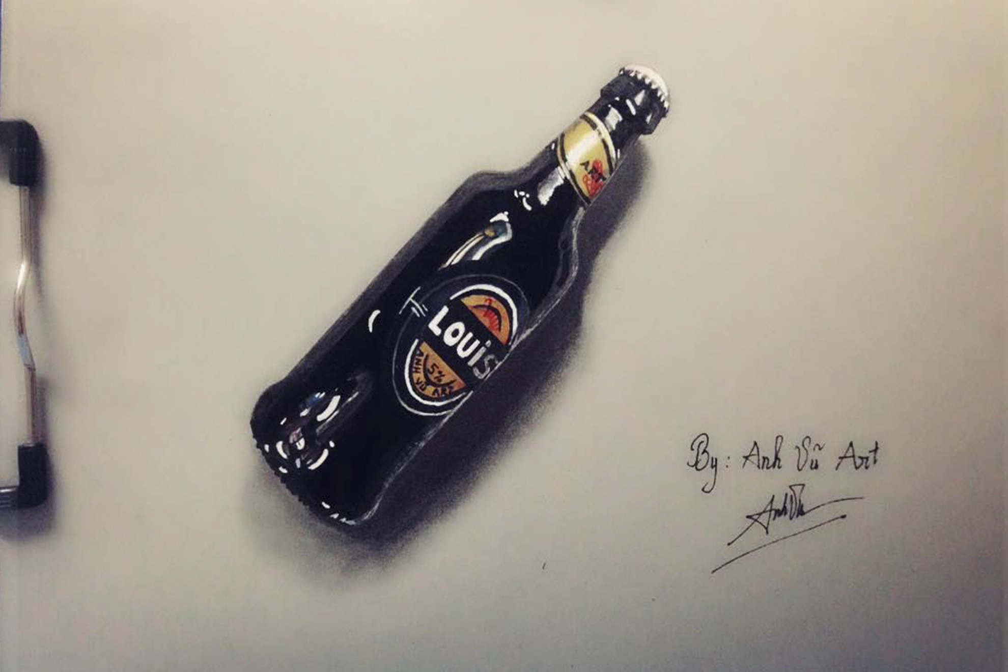| Một bức tranh 3D độc đáo khác do 9X thực hiện. Người xem có thể bị đánh lừa, cho rằng một chai bia thật đang được đặt lên tờ giấy. Ảnh: S.T. |