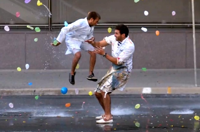 | Gavin Free (trái) và cộng sự Daniel Gruchy trong thử thách ném bóng nước. |