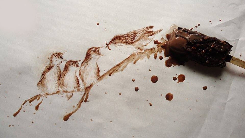 | Bắt đầu vẽ tranh từ khi thi vào khoa Thiết kế đồ họa, Đại học Tôn Đức Thắng, Trần Hoàng Đức (sinh năm 1994) nhận ra mình có năng khiếu với lĩnh vực này. Từ những bức tranh bằng bút chì, cậu nhanh chóng tìm đến phong cách hội họa đa chất liệu. Trong ảnh là tác phẩm chim sẻ về tổ được Đức vẽ hoàn toàn bằng một que kem chocolate. |
