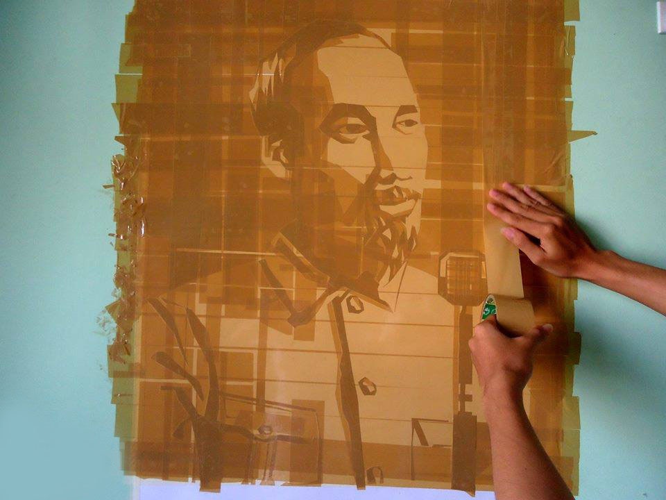 | Chân dung Bác Hồ được sáng tạo bằng băng dính. Đây là tác phẩm mở màn cho loạt tranh vẽ đa chất liệu của Hoàng Đức. Tác giả 9X cho biết, bức tranh này đã được một họa sĩ nước ngoài thực hiện từ trước. Sau đó, cậu vẽ lại thành công và nảy ra câu hỏi: "Tại sao mình không tạo ra những bức tranh với chất liệu độc đáo hơn?".