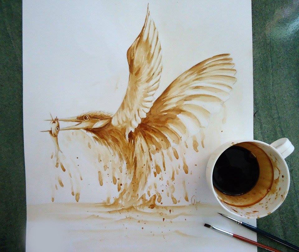 Trần Hoàng Đức gây chú ý với khả năng tạo ra những bức tranh biểu cảm từ chất liệu cà phê, kem, quả mồng tơi, tàn thuốc lá...
