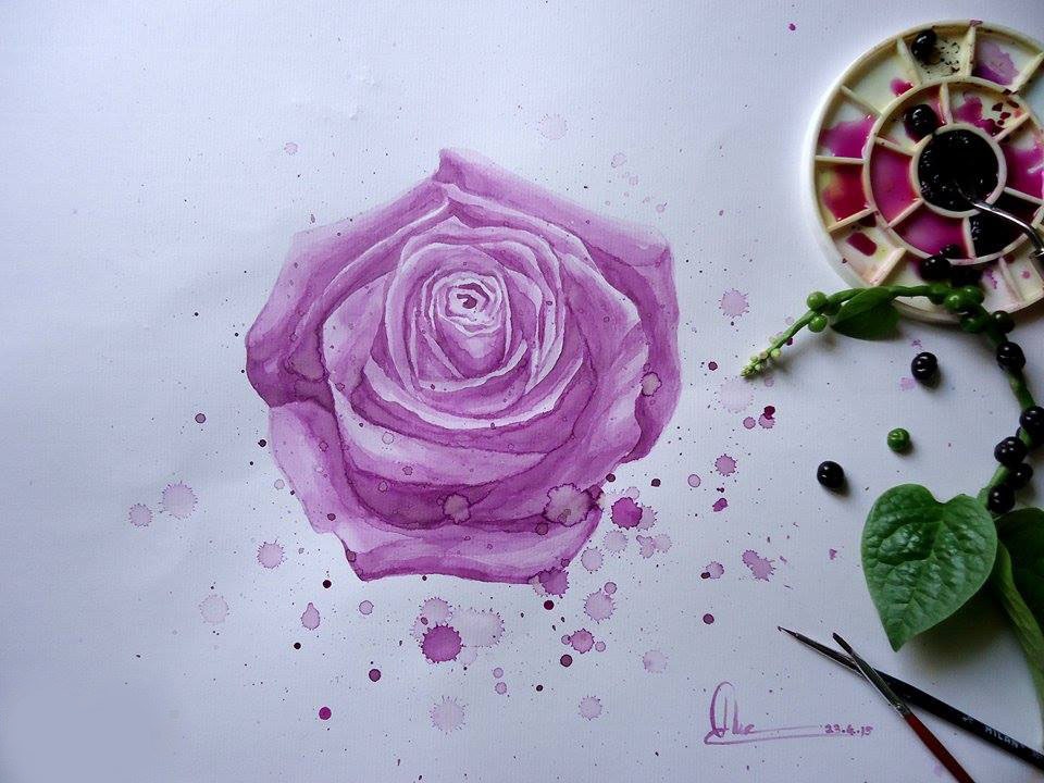 | Những chất liệu được Đức sử dụng hường rất gần gũi với đời sống hàng ngày. Cậu thực hiện bức tranh hoa hồng này trong khoảng 2 tiếng, sau khi ra lang thang bờ giậu tìm hái quả mồng tơi. |