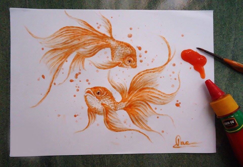 | Tác phẩm "song ngư" được Đức vẽ bằng... tương ớt. Cậu chia sẻ, đây là tác phẩm duy nhất không thể bảo quản vì để lâu, tương ớt sẽ bị hỏng. |