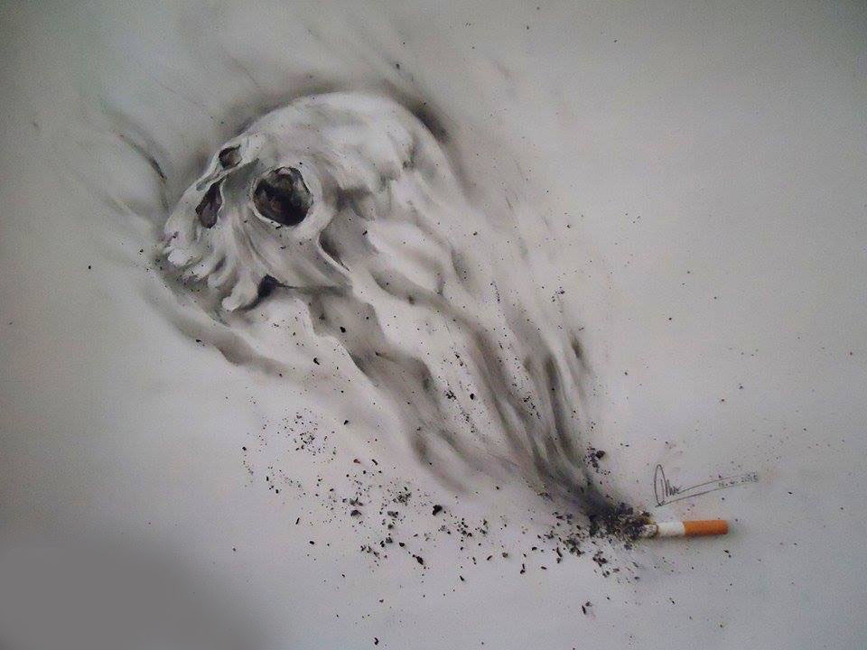 | Bức tranh từ tàn thuốc lá với thông điệp: "Thuốc lá là hiện thân của thần chết". |