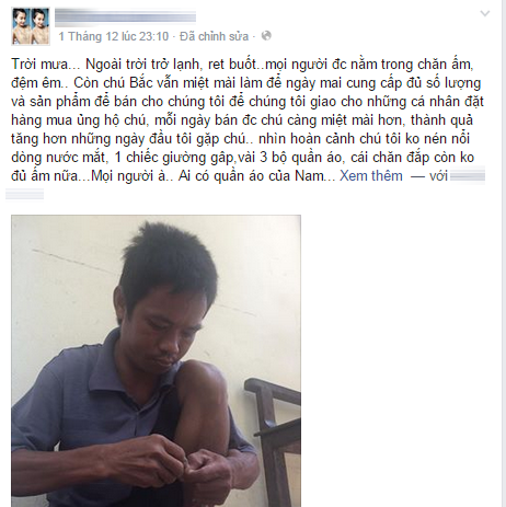 "Trời mưa, ngoài trời trở lạnh, rét buốt, mọi người được nằm trong chăn ấm, nệm êm. Còn chú Bắc vẫn miệt mài làm những móc khóa làm từ ống truyền dịch, để ngày mai cung cấp đủ số lượng và sản phẩm để chúng tôi giao cho những cá nhân đặt hàng mua ủng hộ chú.