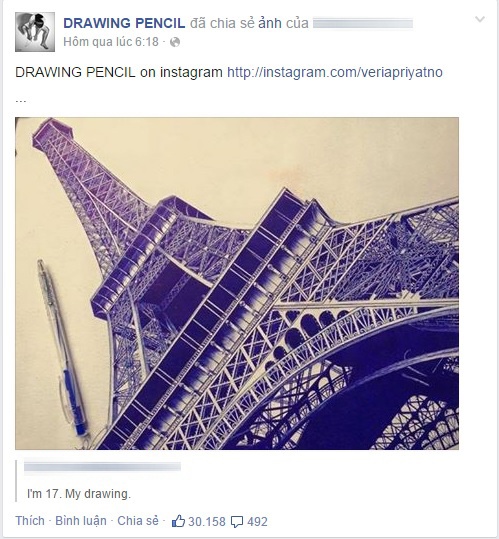 Chiều 3/1 trên diễn đàn mạng quốc tế về diễn họa có tên Drawing Pencil, đã chia sẻ bức vẽ tòa tháp Eiffel (Pháp) bằng bút bi của một cô gái Việt 17 tuổi, tên Vũ Thùy Trang. Nhanh chóng, bức tranh nhận được hơn 30.000 lượt like (thích), cùng hàng trăm bình luận khen ngợi.