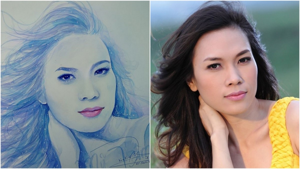 | Bức vẽ nữ ca sĩ Mỹ Tâm của Ken Ken cùng với hỉnh ảnh gốc. |